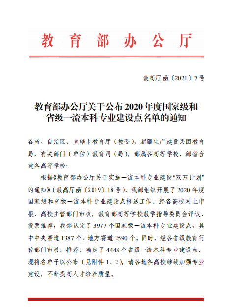 近日,教育部办公厅印发《关于公布2020年度国家级和省级一流本科专业建设点名单的通知》(教高厅函〔2021〕7号),国产探花