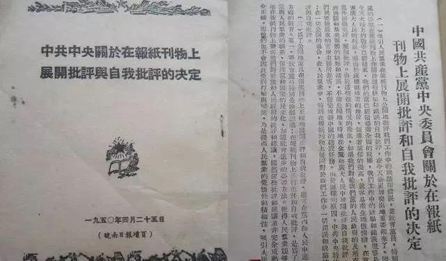 1950年4月19日 中共中央发出《关于在报纸刊物上展开批评和自我批评的决定》