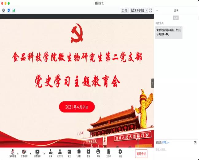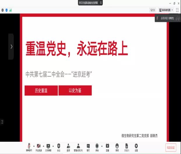 微生物研究生第二党支部在线上召开党史学习主题教育大会。会上,支部的三位党员分享了他们所学习的党史故事,他们分别对“红船精神”、 “长征精神”以及“进京赶考”的党史故事进行了深刻解读。党员们表示,在以习近平同志为核心的党中央坚强领导下,百年大党温故知新再出发。青年学生以昂扬的姿态踏入全面建设社会主义现代化国家新征程,必将从胜利走向新的更伟大的胜利。会议最后,全体党员诵读《七律·长征》,回顾伟大长征精神。