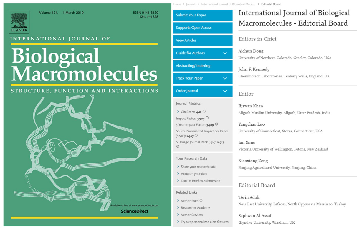 曾晓雄教授于2019年1月起担任国际著名期刊《International Journal of Biological Macromolecules》副主编。《International Journal of Biological Macromolecules》创刊于1979年,由荷兰ELSEVIER出版发行,该期刊最新的影响因子为3.909。该杂志自出版发行以来,一直是天然大分子领域的国际权威期刊之一,主要发表蛋白质、大分子碳水化合物、糖蛋白、生物多酸和核酸等分子结构和性质的最新研究成果,其范围包括生物活性与相互作用、分子缔合、化学与生物修饰以及功能特性等。