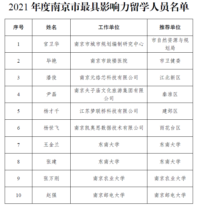 该奖项旨在选育在南京市创新创业一线表现优异、业绩突出的留学回国人员,进一步激发广大留学人员投身创新名城建设、贡献智慧力量。经综合评议,共遴选出10名留学人员入选“2021年度南京市最具影响力留学人员”。