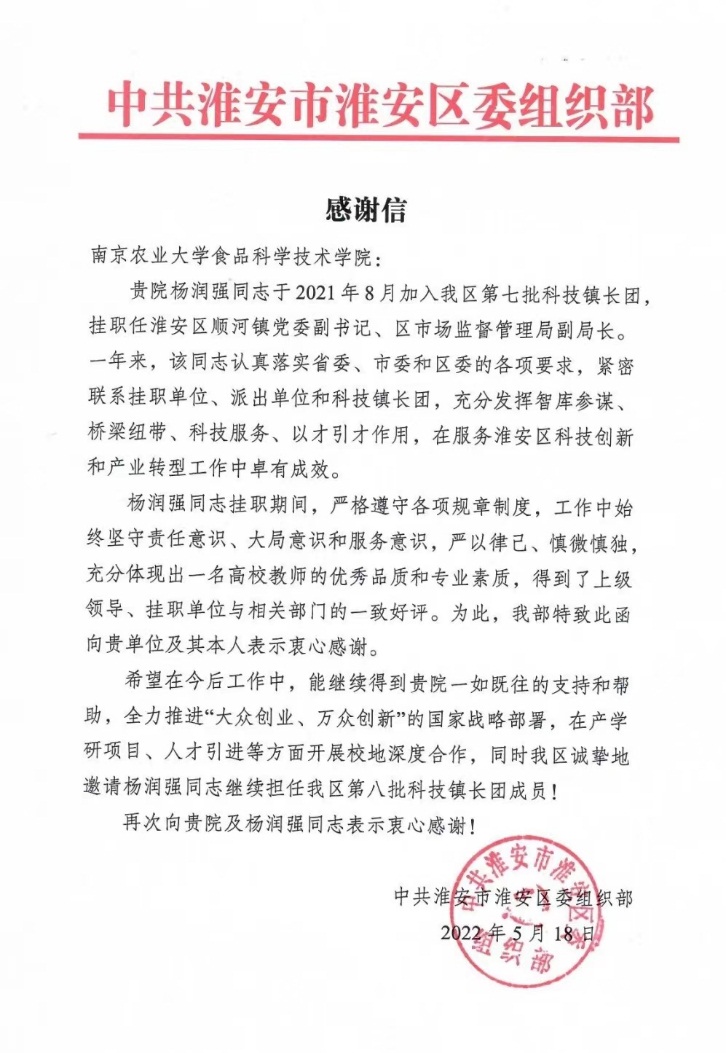 近日,中共淮安市淮安区委组织部为我院杨润强同志发来感谢信。2021年8月,杨润强同志入选江苏省淮安市第七批科技镇长团,挂职担任淮安区顺河镇党委副书记、区市场监督管理局副局长。一年来,杨润强同志深入走访全区农业和食品加工企业,为农产品加工企业提供技术指导;邀请国产探花
