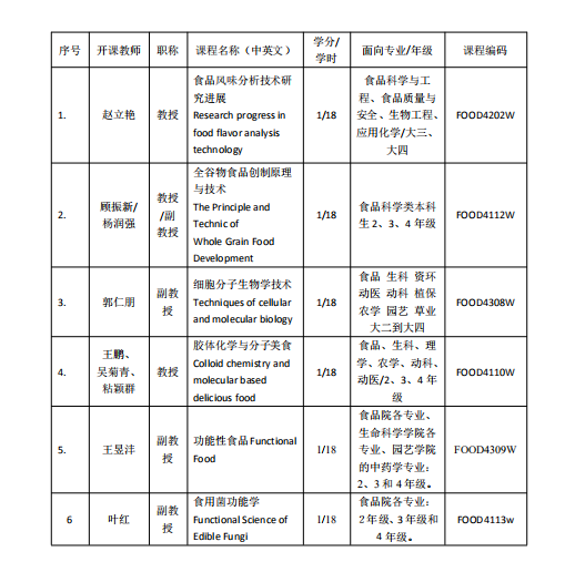 本课程面向食品科学与工程类本科生和研究生开设。课程从谷物原料特性、营养功能特性及其品质提升、全谷物加工特性等方面系统教授全谷物食品创制原理与技术,具体内容包括:全谷物食品概述、原料特点与加工适性、功能性全谷物食品创制原理、营养与功能成分及其特性、产品质量控制技术等。