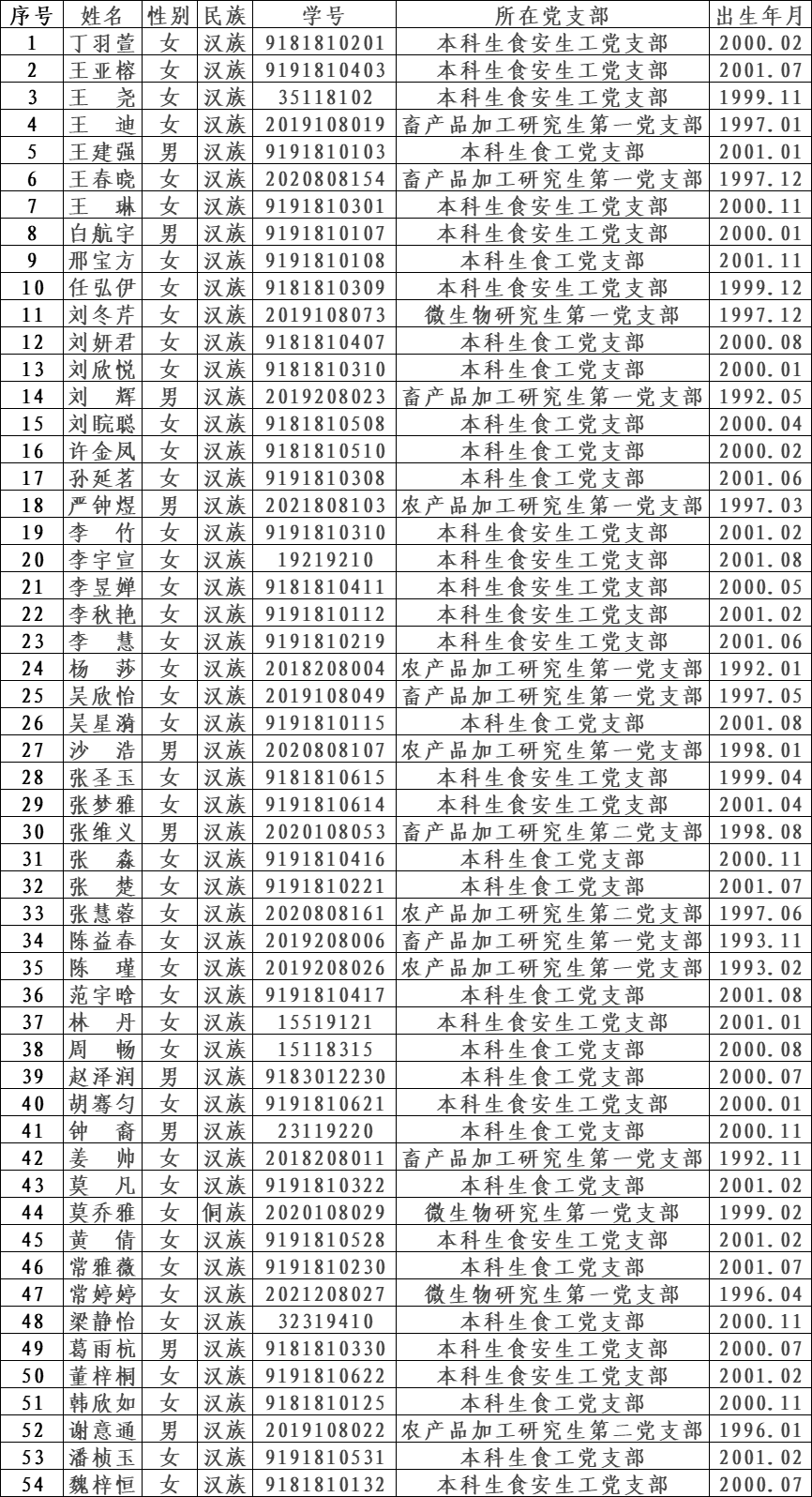 党组织一年以上的线上和线下系列培训教育,以及对发展对象的志愿服务、任职经历、科研水平、学业成绩、创新能力等的综合考察,现拟将丁羽萱等 54 位同志确定为党员发展对象。现将具体名单公示如下(按姓氏笔画排序):