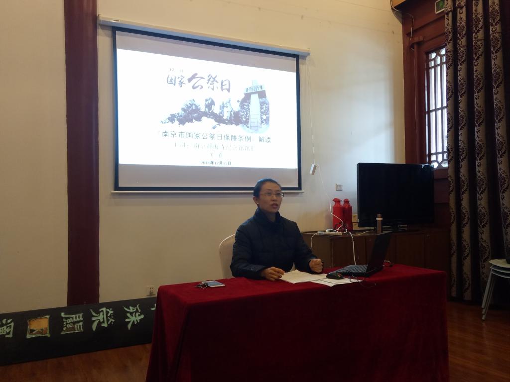 首先在南京静海寺纪念馆馆长苏真女士的倡议下,大家进行了一分钟默哀仪式,低头肃立,沉痛悼念。随后她为大家解读了《南京市国家公祭日保障条例》,介绍了《南京市国家公祭日保障条例》的来源,对侵华日军南京大屠杀遇难同胞重要丛葬地煤炭港、中山码头、挹江门、金陵船厂进行介绍,旨在引导学员们“铭记历史、勿忘国耻、以史为鉴、振兴中华”。最后,学员们前往挹江门丛葬地纪念碑,依次上前为英烈献上亲手叠好的纸花,寄托哀思。