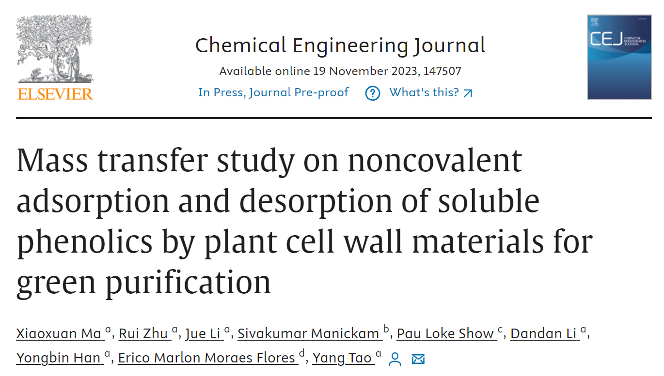 2023年11月,食品国产探花 韩永斌、陶阳课题组在国际期刊Chemical Engineering Journal发表题为“Mass transfer study on noncovalent adsorption and desorption of soluble phenolics by plant cell wall materials for green purification”的研究性论文。揭示了植物细胞壁材料非共价吸附/解离可溶性多酚的物理传质新机制,开发了可溶性多酚绿色纯化新技术。